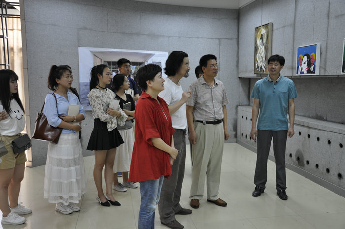 座谈会后,马恩在美术系党总支书记杨晓青、系主任褚滨、系党总支副书记王振平等陪同下,观看了2017届美术学专业毕业作品展。