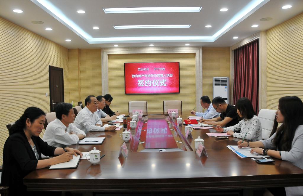 5月15日,济宁学院、英谷教育“教育部产学合作协同育人项目” 签约仪式在我校隆重举行,校党委委员、副院长朱松涛,英谷教育董事会执行主席韩敬海、总裁王燕出席仪式,学校发展规划处、教务处、招生与就业指导处、相关专业负责同志及项目负责人,英谷教育运营服务中心负责同志参加仪式。朱松涛、韩敬海代表双方签署了协议。