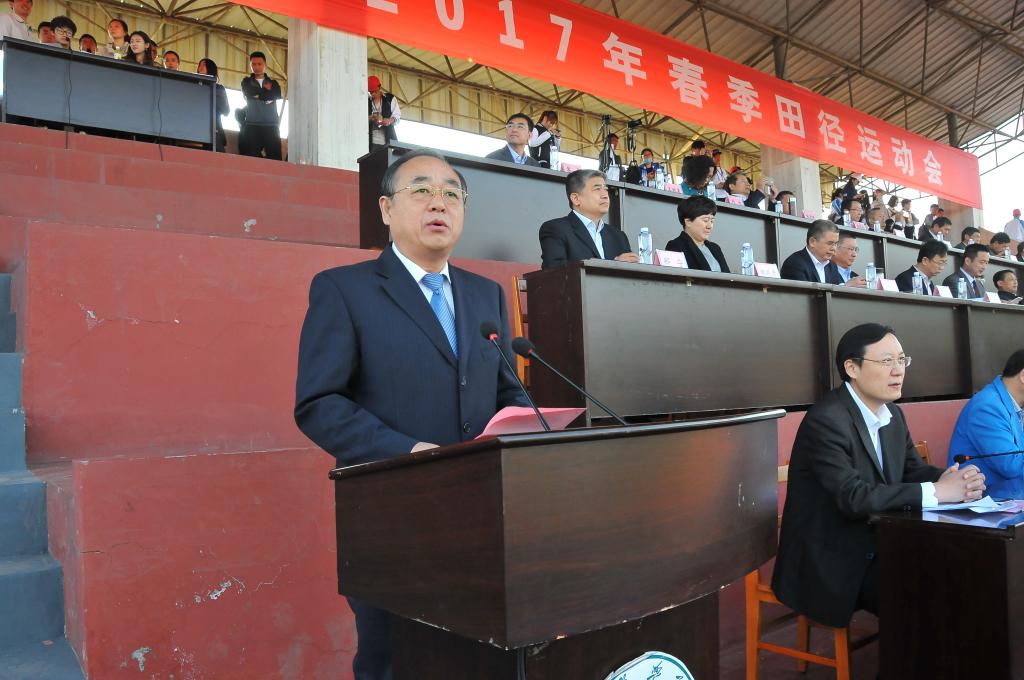 朱松涛在致辞中说,2017年春季田径运动会是全面贯彻落实学校党代会和四届三次“双代会”精神,加快推进学校改革发展的新形势下召开的一次盛会,也是我校建院升本十周年系列活动的一项重要内容。体育是学校人才培养的重要内容,是学校精神文明建设和校园文化建设的重要组成部分。一直以来,学校高度重视体育工作,始终把培养学生的健康体质放在重要位置,不断深化体育教学改革,不断加大体育基础设施建设,积极组织开展丰富多彩的全民健身运动和竞技体育活动,营造了浓厚的校园体育文化氛围,促进了师生员工身心健康和学校竞技体育水平的不断提高。本次运动会是对学校体育工作、师生素质的又一次检阅,也是学校师生精神面貌的又一次展现。他希望全体运动员要奋勇争先、团结拼搏,赛出风格、赛出水平、赛出友谊;全体裁判员和工作人员要公正无私、乐于奉献;全体师生员工要讲文明、讲公德、守纪律,自觉遵守赛场秩序,确保本次运动会顺利进行,共同营造积极文明、健康向上、团结奋进的校园体育新风尚。