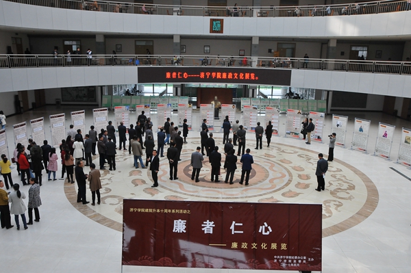 4月11日下午,学校在图书馆二楼大厅举办“廉者仁心----廉政文化展览”,党委书记郁章玉,党委副书记马恩,党委委员、副院长刘德胜、朱松涛,党委委员、纪委书记许记中,党委委员、副院长李继凯、王旭英,校纪委委员、处级干部、基层党组织纪检委员,党政管理部门、群团组织正科级干部,学生代表等共计200余人参观了展览。