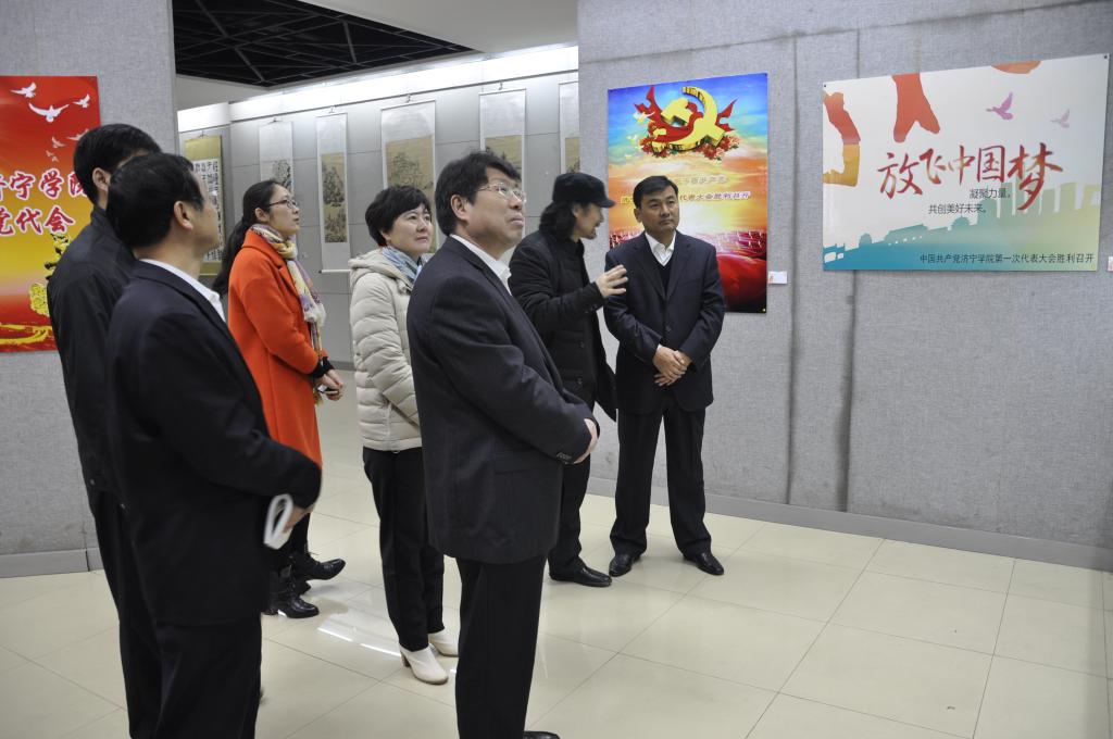 许记中代表学校对展览开幕表示祝贺。他说,值中国共产党济宁学院第一次代表大会召开之际,全校师生以精美的书画设计作品向党代会献礼,作品集中体现了我校师生对党的热爱,饱含着对学校发展的美好祝愿。他呼吁让我们不忘初心、继续前进,凝心聚力、奋发作为,撸起袖子加油干,为把我校早日建成特色鲜明的应用型大学而努力奋斗。