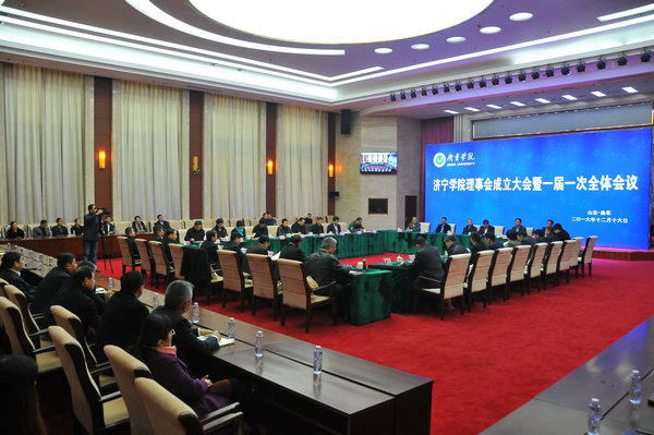 为贯彻落实《中华人民共和国高等教育法》、《普通高等学校理事会规程(试行)》、《济宁学院章程》,加强学校与社会各界的联系与合作,更好地发挥学校为社会发展服务的功能,12月16日,济宁学院理事会成立大会暨一届一次全体会议在科技文化大楼学术报告厅隆重举行。学校党委书记郁章玉,党委副书记、院长吕灵昌,党委委员、副院长刘德胜、朱松涛,学校原党委书记王应进、原院长罗家英出席会议,驻地政府、社会人士、知名专家、共建单位、行业组织、企业事业单位、杰出校友代表,以及学校相关职能部门负责人和师生代表参加了会议。会议由刘德胜主持。