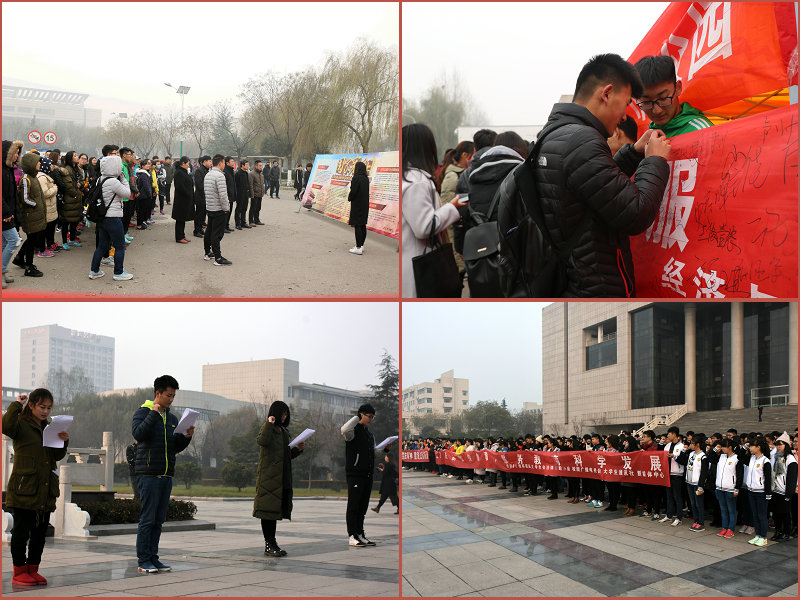 12月4日上午,在杏坛广场开展了国家宪法日宣誓活动。在我校法律咨询协会、志愿者服务中心、校园广播电视台、大学生通讯社、大学生新媒体中心等学生社团的发起下,全校500余名学生代表面对庄严的国旗,举起右手,庄严宣誓,表达了崇尚宪法、遵守宪法、维护宪法的决心。他们还向广大师生宣传国家宪法日的由来、内容、意义以及宪法日的相关知识等,为普及宪法知识、增强宪法意识、弘扬宪法精神、推动宪法实施作出贡献。