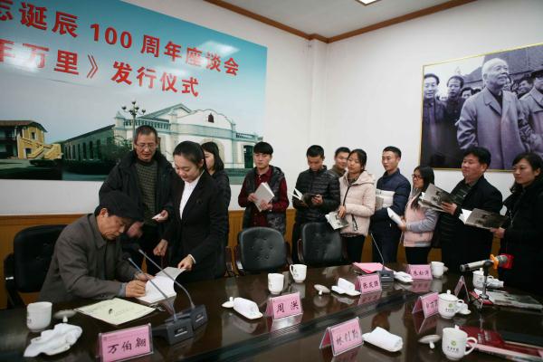 北京来宾张发强、《百年万里》主编宋思伟、作者和教师代表刘振佳、大学生代表李逸莹等在座谈会上先后发言。座谈会后,万伯翱向与会领导和师生代表签名赠送了《百年万里》一书。