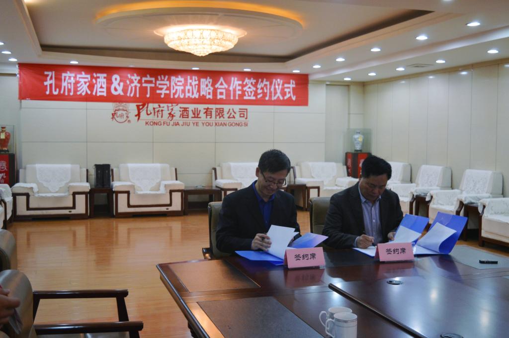 11月25日,济宁学院与孔府家酒业有限公司战略合作协议签字仪式在孔府家酒业有限公司隆重举行,学校党委副书记、校长吕灵昌,党委委员、副院长朱松涛,孔府家酒业总经理刘涛、市场总监左清河、酿酒总经理王爱民出席签约仪式,学校发展规划处、教务处、招生与就业指导处、生命科学与工程系、酿酒专业负责人,孔府家酒业酿酒大师魏金宝、国家级品酒师张洪奇参加仪式。吕灵昌、刘涛分别讲话,吕灵昌与刘涛代表双方签署了战略合作协议,并举行了“济宁学院实践教学基地”授牌仪式。