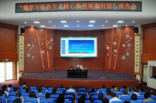 9月21日下午,山东省委组织部名师送教专家库儒学专家、我校儒学与地域文化研究传播中心副主任刘振佳教授,在理科楼学术报告厅作了题为“儒家学说与大国文道——习近平总书记传统文化系列讲话解读”的精彩报告。由科研处、宣传部、团委联合举办的这次报告会,既是“儒学与社会主义核心价值观”面对面系列学术报告之一,又是“两学一做”学习教育专题党课,还是一次我校“文化讲堂”学术报告。校党委宣传部部长邓新民主持报告会。