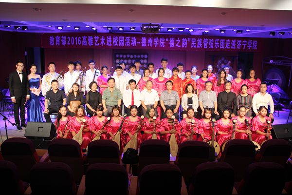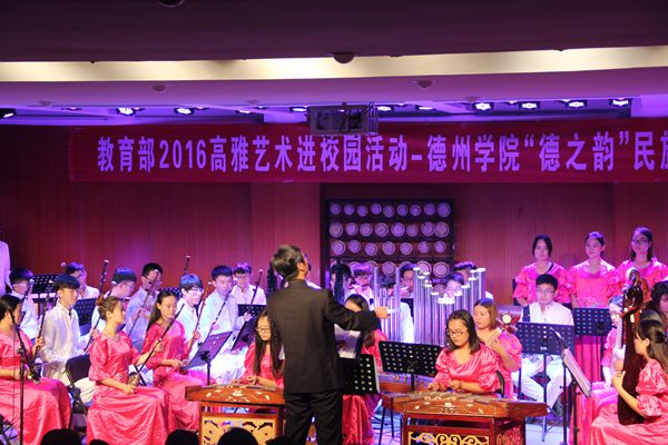 9月21日下午,为响应教育部“高雅艺术进校园”活动,德州学院音乐学院院长张国庆带领“德之韵”民族管弦乐团来我校举办专场音乐会。音乐系领导及广大师生观看了音乐会。
