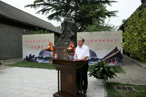 在悠扬典雅的古琴曲声中,朱松涛、朱宁波代表师生向先师孔子像敬献花篮,宋思伟宣读祭文,全体师生怀着崇敬之情向孔子像行鞠躬礼。