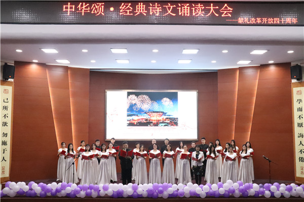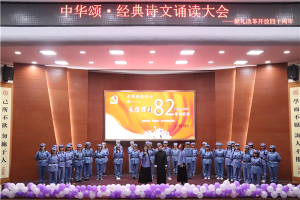 兴中华,承前启后;扬国威,万众一心!诵读大会在宣传片《伟大的变革》的放映中拉开序幕。诗文诵读《四十年岁月如歌》《四十年与祖国风雨兼程》《改革开放四十周年》回顾了中国四十年的风云巨变,展示了改革浪潮中锐意进取、团结一心、奋进勃发的中国;《沁园春•长沙》《你们是最可爱的人》追忆往昔峥嵘岁月,激励后人不忘初心,砥砺前行;《今日中国》《新时代的中国》诵出了新一代青年对祖国的满腔热血,诵出了中华民族自强不息的奋斗精神;由中文系师生党员共同诵读的《再道一声:小平,您好!》句句铿锵、声声深情,真切地表达出对改革开放总设计师——邓小平的缅怀与歌颂。经典诗文诵读配以悠扬旋律,声声悦耳、句句华章,生动的演绎了一场视觉与听觉的饕餮盛宴。