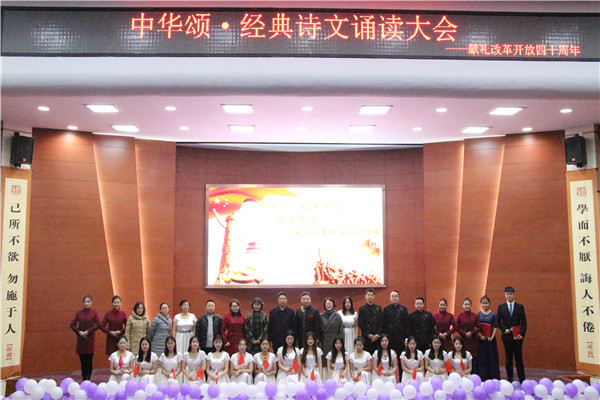 11月29日晚,献礼改革开放40周年——“中华颂•经典诗文诵读大会”在理科楼报告厅成功举办。校党委副书记马恩出席大会,并为获奖集体颁奖。中文系等相关负责同志参加活动,学校400余名师生代表共同观看了诵读汇演。