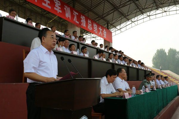 朱松涛作总结讲话。他代表学校向担任承训部队教官表示衷心的感谢和崇高的敬意!向圆满完成军训任务的2016级新同学表示热烈的祝贺!他说,中国人民解放军71988部队是一支有着光荣的革命传统和优良的军事作风的部队。在军训中,全体教官以饱满的政治热情、严谨细致的工作作风、特别能吃苦的军人品质,充分体现了人民军队的光荣传统和优良作风。通过教官精心的组织,科学的安排,严格的训练,确保了今年学校6000多名新生军训工作的圆满成功。他强调,开展军训是人才培养的重要内容和提高大学生国防意识的重要举措。通过军训,同学们重新认识了自己,增加了自信心和自豪感;增强了荣誉感,加强了纪律性,强化了集体主义精神,提高了集体凝聚力和战斗力;掌握了基本的军事知识和技能,了解了国防科学知识,增强了国防观念和国防安全意识;提高了思想道德素质、科学文化素质和身体心理素质。他希望同学们在今后的学习和生活中,要始终保持军训中形成和表现出来的坚忍不拔的意志、坚不可摧的作风、勇往直前的英雄气概和团结互助的精神,保持高度的组织纪律性,认真学好科学文化知识,全面提高自身素质,努力做到纪律严明、作风优良、博学创新,不断超越自我、不断砺练自我,为实现人生理想而奋斗,为建设祖国、保卫祖国做出自己应有的贡献!