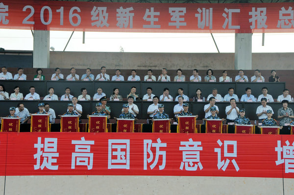 9月14日上午,2016级新生军训汇报总结大会在东操场举行。学校党委书记郁章玉,党委副书记、院长吕灵昌,党委委员、副院长刘德胜、朱松涛,中国人民解放军 71988部队少校程祥其出席大会。大会由学生工作处(武装部)处长、团委书记李凡路主持。