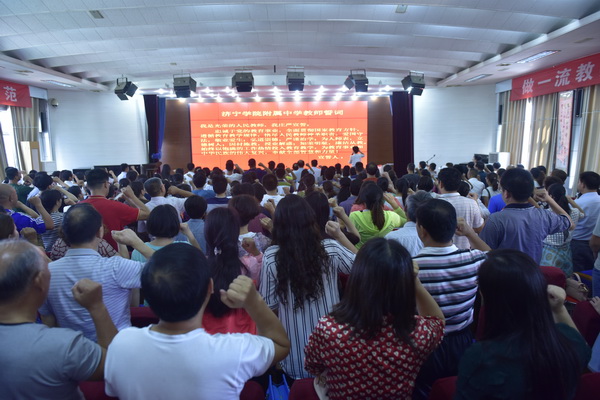 为全面贯彻济宁市教育局《关于组织开展教师宣誓活动的通知》(济教函【2016】43号)精神,大力开展师德师风建设,8月28日上午,济宁学院附中召开全体教师会,举行教师宣誓仪式。