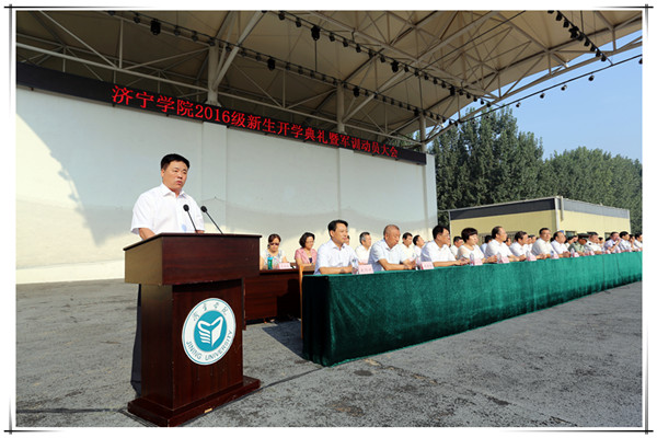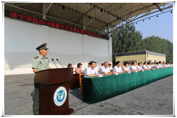 会上,郁章玉为“济宁学院2016级学生军训团”授旗。吕灵昌在致辞中首先代表学校对新同学的到来表示热烈的欢迎,对负责军训工作的部队官兵表示衷心的感谢,他说,近年来,学校全面推进综合改革,教学质量和办学效益不断提高,学校各项事业蓬勃发展,2016级学生的到来为济宁学院注入了新鲜血液,使学校增添了生机和活力。他向新同学提出了四点希望:一是希望同学们坚定理想,规划人生。大学生活是人生的一个重要阶段,“凡事预则立,不预则废”,对未来有规划可以避免走弯路,能为了心中的希望和梦想不懈地去奋斗。只有坚持理想不懈怠,脚踏实地去拼搏,人生才会更精彩。二是希望同学们勤奋学习,知行统一。上大学是进入一个文化层次、打造一方精神家园、升华一种人生境界的过程,其充实而丰富的外延,体现在一次次听课、讨论、记笔记的轮回之中;体现在一趟趟教室、宿舍、图书馆的循环之中;体现在数不清的枯燥乏味、冥思苦想、愁肠百结、精疲力尽后恍然大悟的喜悦之中。“纸上得来终觉浅,绝知此事要躬行。”要坚持知行合一,注重在实践中学真知、悟真谛,加强磨练、增长本领。三是希望同学们戒浮戒躁,坚毅力行。“互联网+”时代,既为同学们提供了便捷的求知渠道,同时也给同学们的学习带来了不少干扰,希望同学们能够心宁气静,踏实厚重,增强对浮躁的免疫力,充实自己的精神,提升自己的境界,陶冶自己的生活,培养健康的心智、坚强的意志、果敢坚毅的作为,为成为一名高素质的人才打好基础。四是希望同学们敬业乐群,友爱待人。做一个有远志、有远见、有责任心的人,做到读书、做事专心有恒,精勤不懈;做到随事留心,增长自己的见识;做到随事磨炼,增长自己的经验能力。要心怀坦诚,友爱待人,在和谐、友爱的氛围中度过美好的大学时光。