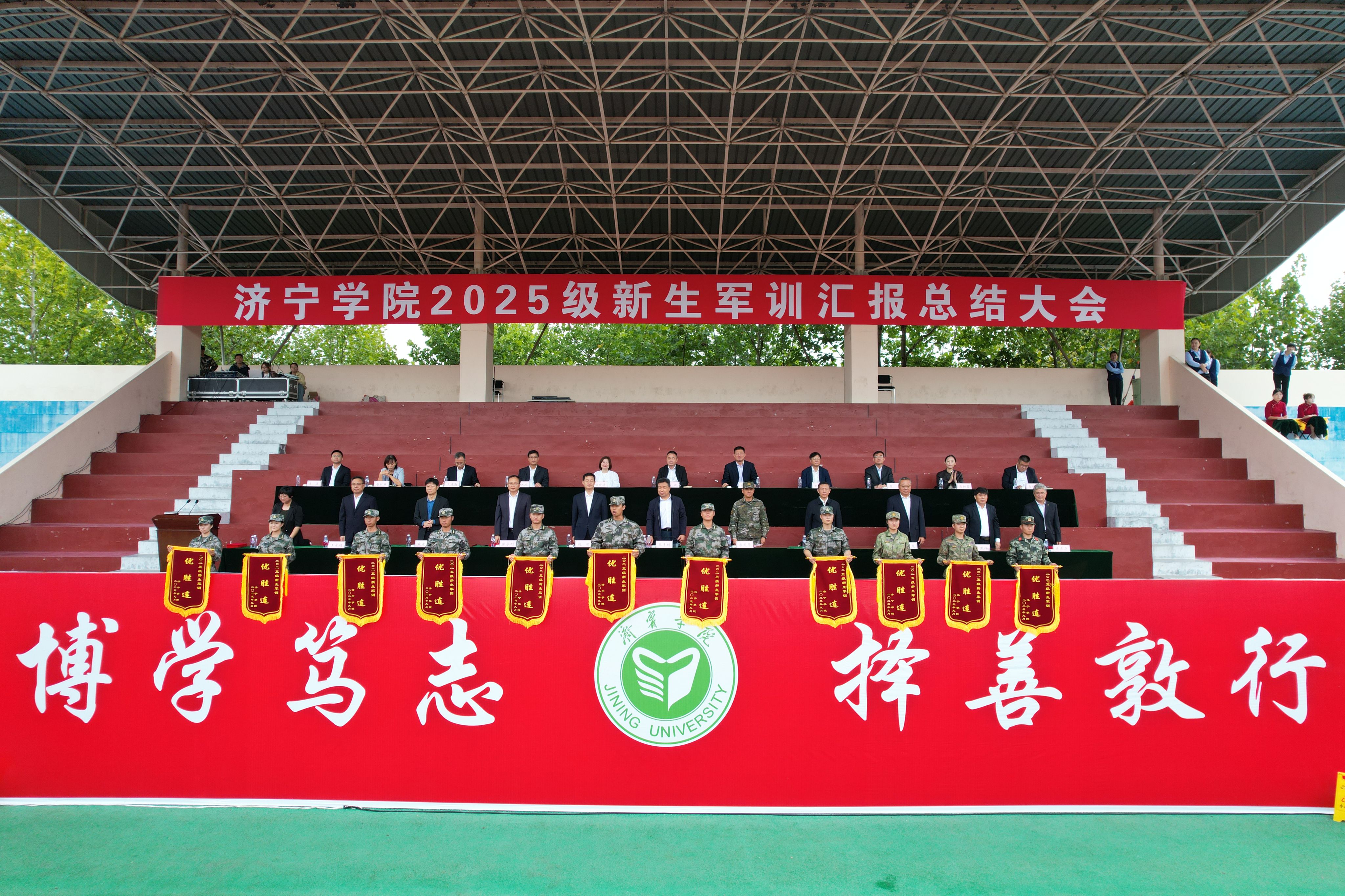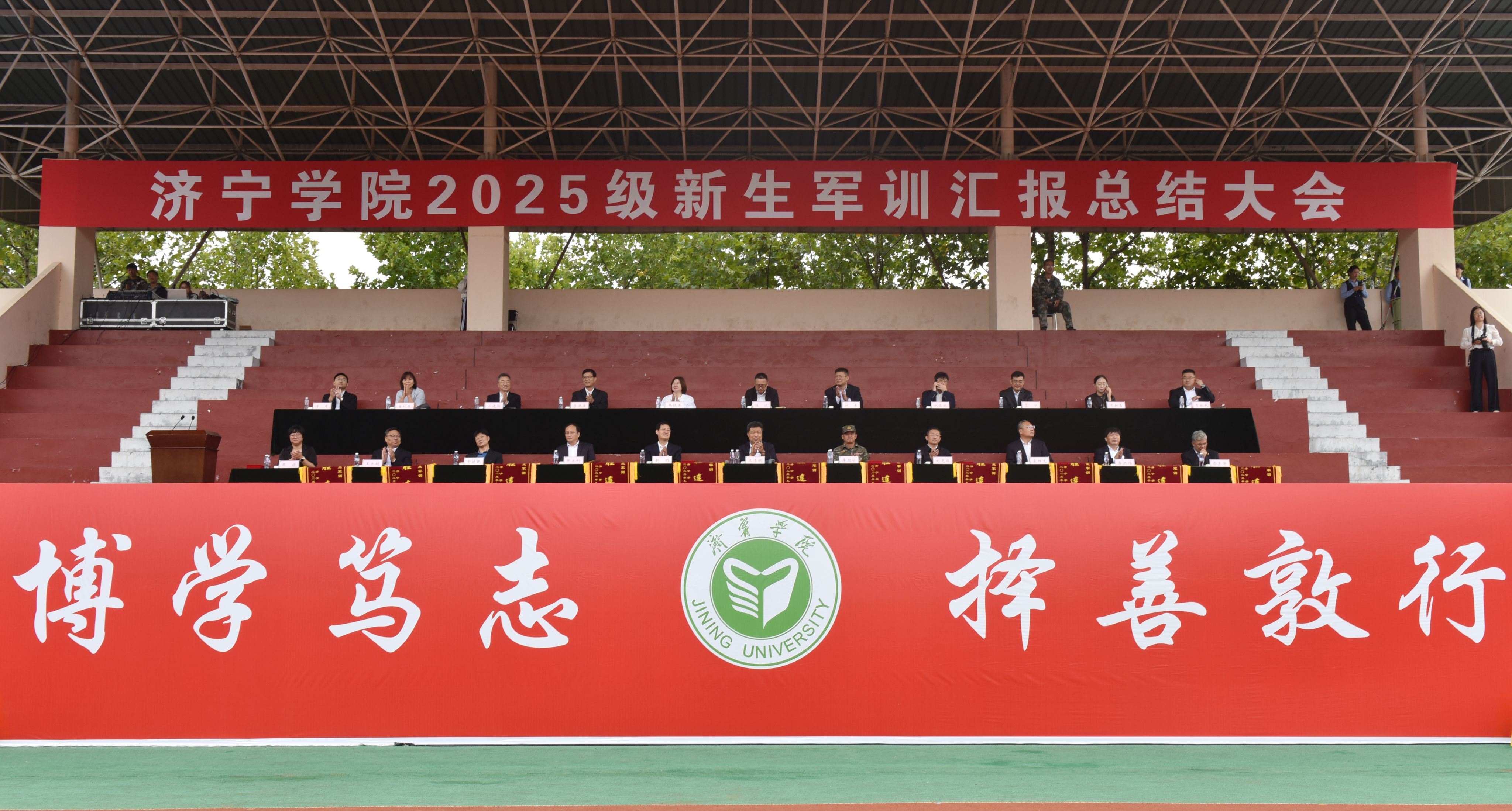 9月28日上午,学校2025级新生军训汇报总结大会在东操场隆重举行。校党委副书记、校长王清明,校党委委员、副校长赵明,校党委委员、宣传部部长刘克非,武警济宁支队大队长李国华出席大会。