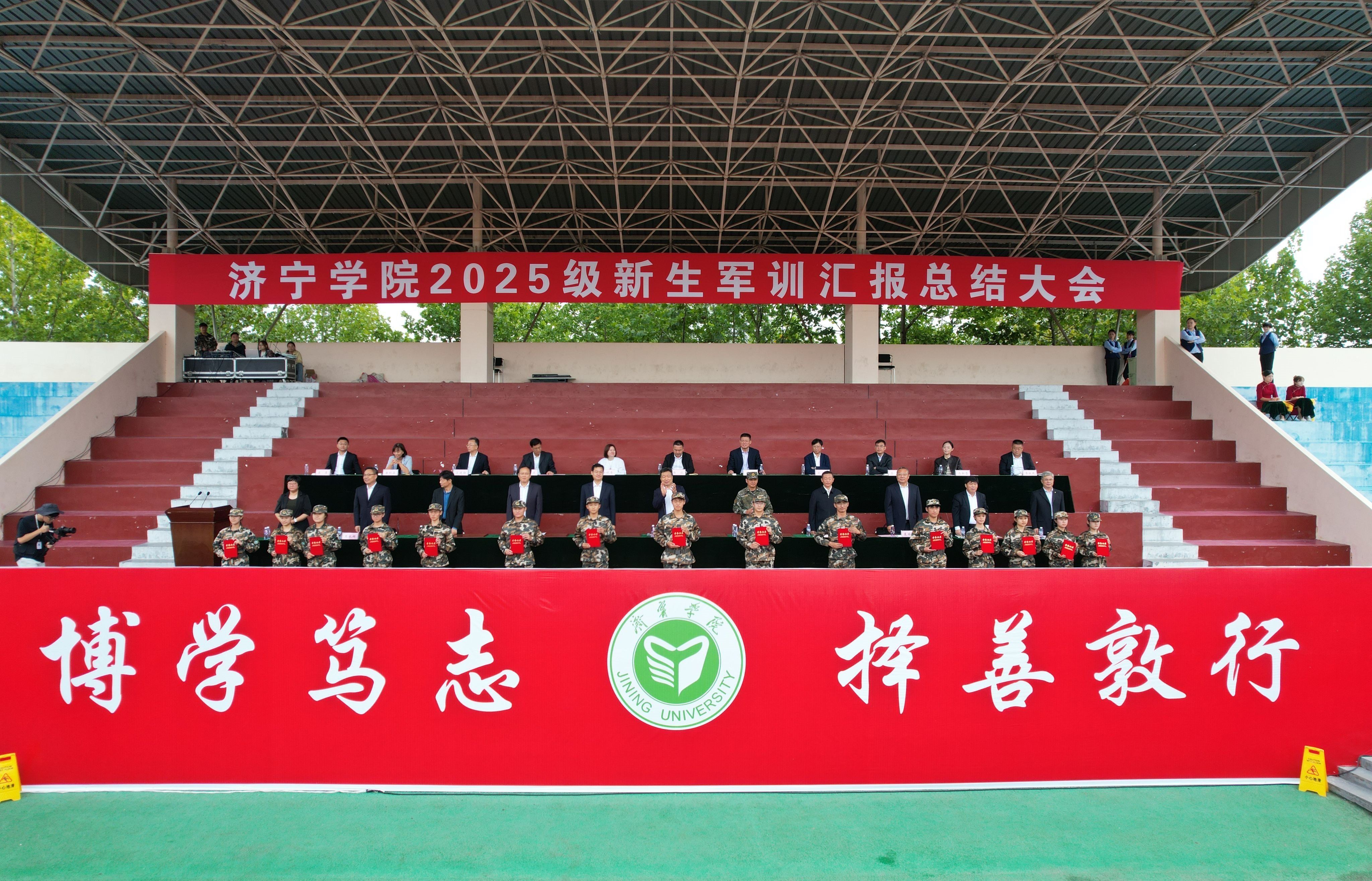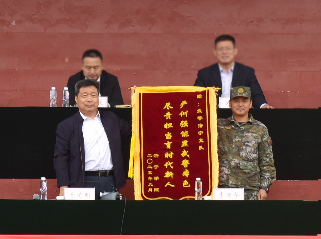 会上,王清明代表学校向武警济宁支队赠送锦旗,向退役大学生教官团队颁发特殊贡献奖。刘克非宣读了《关于表彰2025级新生军训优胜连队、优秀带训辅导员和优秀军训学员的决定》。主席台领导为获奖先进集体和先进个人代表,颁发了奖牌和证书。