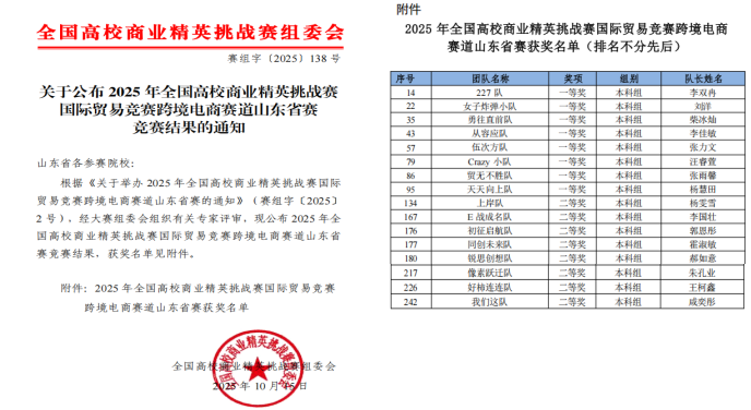 近日,2025年全国高校商业精英挑战赛国际贸易竞赛跨境电商赛道山东省赛结果正式公布,我校外国语学院17支队伍参赛,共荣获省级一等奖8项(全省共112项),二等奖8项,展现出扎实的专业素养、出色的跨境电商实战能力与卓越的团队协作精神。其中,8项一等奖全部晋级国赛。