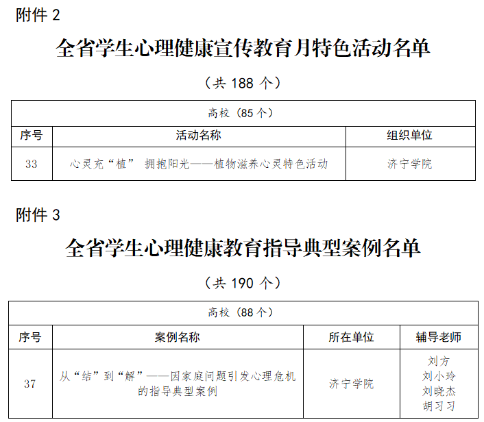 其中,生命科学与工程学院周鲁,学生工作处刘小玲、刘方共同指导的《心灵充“植” 拥抱阳光——植物滋养心灵特色活动》获评山东省学生心理健康宣传教育月特色活动。学生工作处刘方、刘小玲、刘晓杰、胡习习撰写的《从“结”到“解”——因家庭问题引发心理危机的指导典型案例》被评为山东省学生心理健康教育指导典型案例。