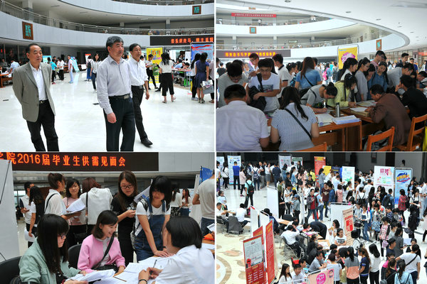 5月27日上午,我校2016届毕业生供需见面会在图书馆二楼大厅成功举办。学校党委书记郁章玉、副校长朱松涛和招生与就业指导处处长李传银等到现场指导。