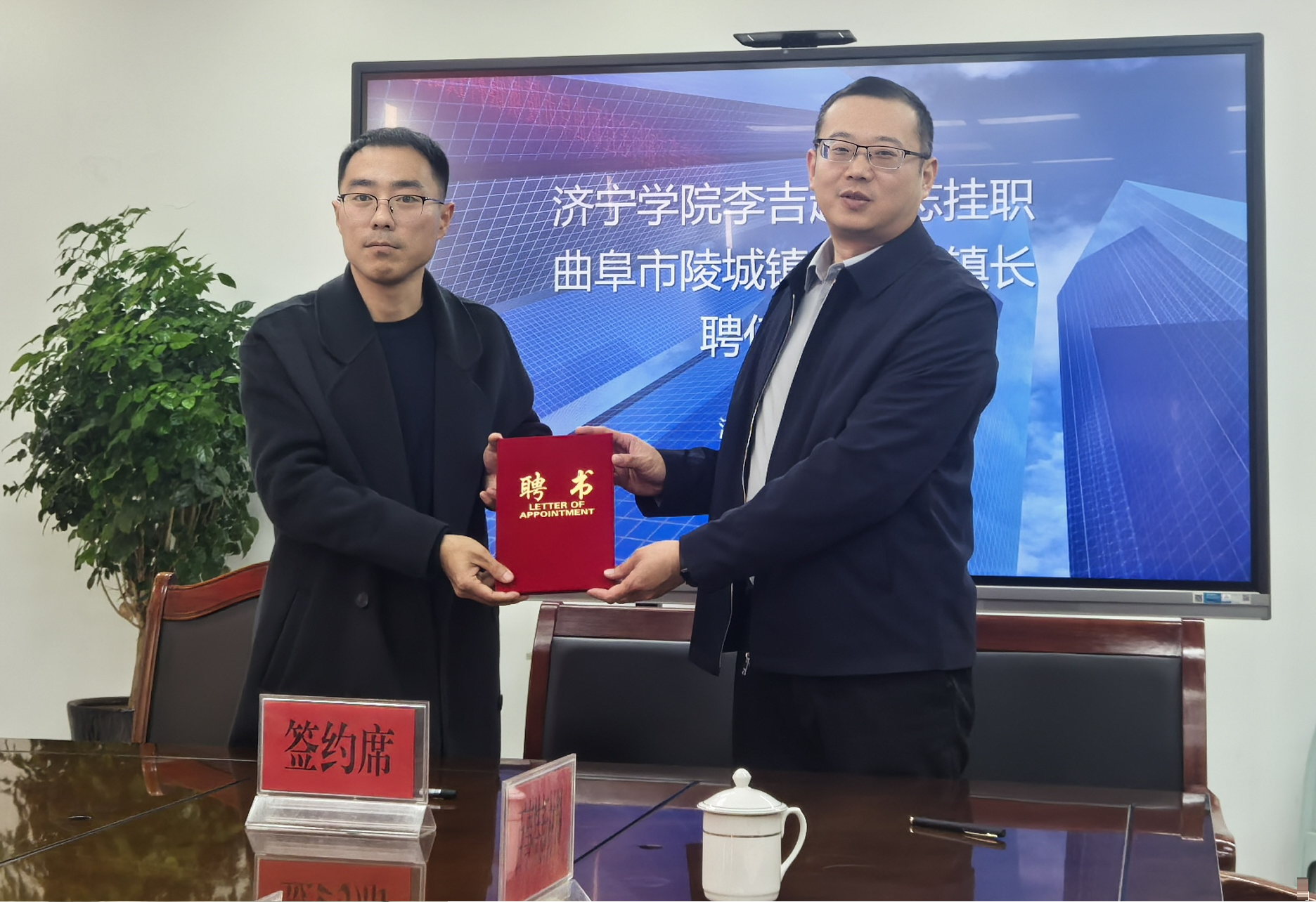 宋文路和张营分别介绍了学校产学研工作进展和机电工程学院服务地方发展的相关情况,表达了对校地合作、技术赋能的坚定信心。随后,双方举行聘任协议签约仪式,并为李吉超颁发科技副镇长聘书。