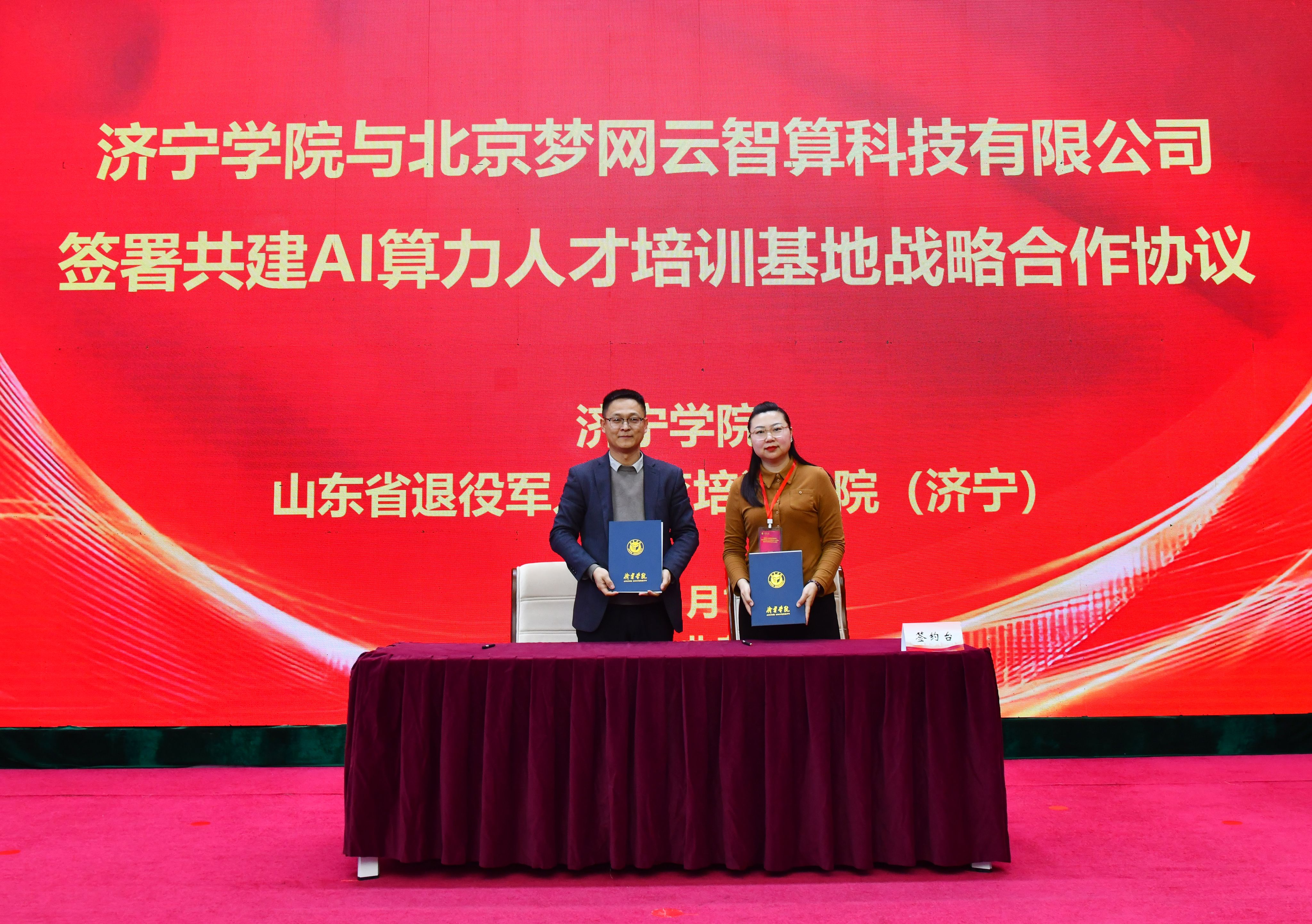 济宁学院教育培训学院院长曹光海、北京梦网云智算科技有限公司产学研发展事务部主任陈缘代表双方签署共建AI算力人才培训基地战略合作协议。