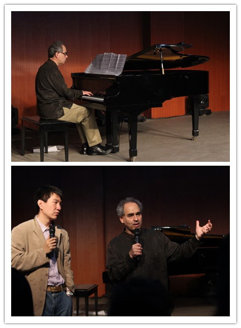 讲座中,霍夫曼教授采取现场钢琴演奏和现场问答两种方式与我系师生交流。他先后演奏了舒伯特、勃拉姆斯、勋伯格以及他自己创作的作品,并将大师们的作品与自己的音乐创作完美的融合在一起,使作品之间既相对独立又相互联系,无痕衔接展现了霍夫曼教授突出的作曲技巧。现场提问环节中,霍夫曼教授详细、耐心地解答了师生们提出的各种专业性问题,讲解深受师生欢迎。