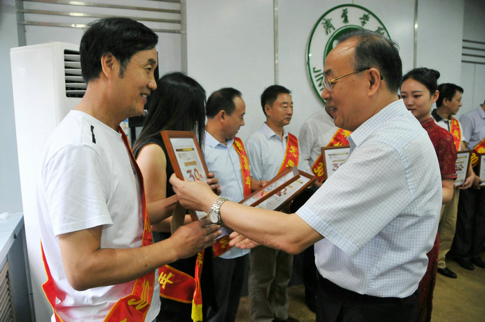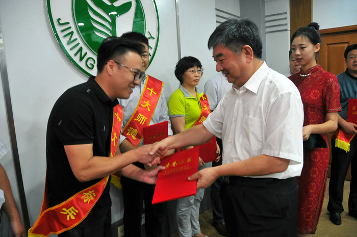 会议对2017年度济宁学院十大师德标兵进行了表彰,学校领导郁章玉、朱松涛分别为师德标兵、我校30年教龄教师颁发了证书。30年教龄教师代表魏丽莉、十大师德标兵代表王永超作了发言。