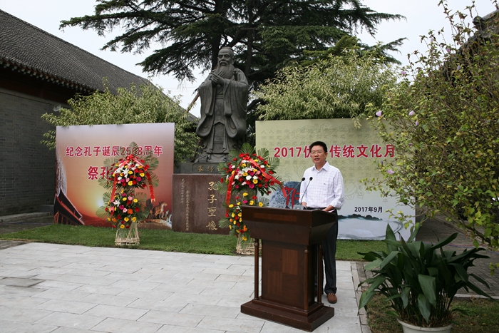 在悠扬典雅的古琴曲声中,马恩、朱宁波代表师生向先师孔子像敬献花篮,宋思伟恭读了祭文,全体师生怀着崇敬之情向孔子像行了鞠躬礼。