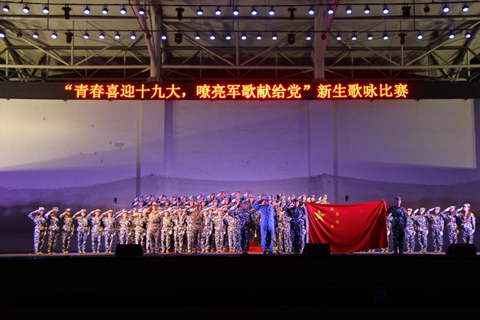 红旗飘扬,歌声荡漾。夜晚的运动场成为军歌的海洋。同学们身着迷彩军装,精神抖擞,斗志昂扬。13支参赛连队以整齐的队列、饱满的热情、良好的精神风貌先后登台演唱《强军战歌》《黄河大合唱》《不松铁拳头》《祖国不会忘记》《中国军魂》《在灿烂的阳光下》等一首首耳熟能详、脍炙人口的经典歌曲,表达了广大青年学生对党、对人民军队的热爱和对大学新生活的无限向往。