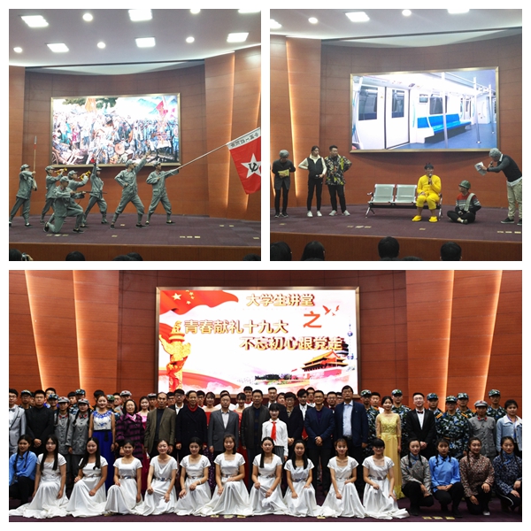 “没有共产党,就没有新中国”,大学生讲堂系列活动在激昂的旋律中拉开了帷幕。单人演讲《不忘初心、砥砺前行的中国共产党》,带领大家回顾了中国共产党成立96年来团结带领中国人民所走过的波澜壮阔的历史进程和作出的伟大历史贡献;随后,心声组合为同学们带来了乐器合奏《映山红》,悠扬的旋律直达同学们的内心,赢得了阵阵掌声;年代音乐剧《不朽的军旗》完美诠释了革命军队与百姓之间的深厚感情;中场环节,进行了十九大相关知识问答,在场同学积极发言,活跃了全场气氛;小品《地铁故事2》以幽默诙谐的方式演绎出令人深思的社会现实问题,传递了正能量,弘扬了社会主义核心价值观;集体朗诵《让我们放歌十九大》抒发了当代青年的爱国热情,令在场师生为之动容;最后,晚会在激昂的大合唱《国家》中落下帷幕。