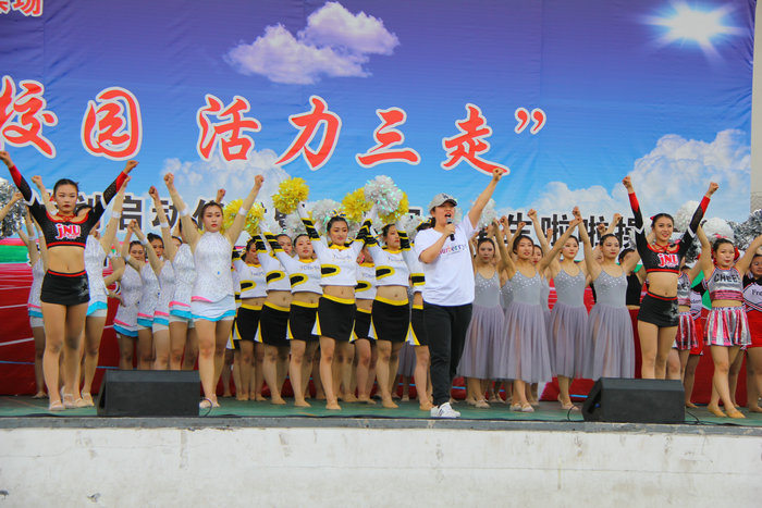 比赛接近尾声,我校体育系教师校啦啦操队指导老师杨皖霖应邀上台,带领台上的全体参赛选手和全体观众展开亲密互动,现场师生一起跳起健康啦啦操,共同感受运动带来的快乐和健康。