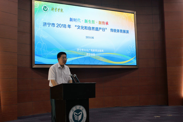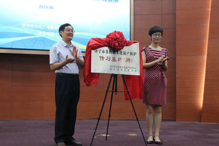 6月6日上午,济宁市2018年“国家文化和自然遗产日”传统体育宣传展演暨非物质文化遗产论坛开幕式,在理科楼报告厅举行。校党委副书记马恩、济宁市文化广播新闻出版局调研员张康出席展演活动,并分别致辞。校团委书记马新蕾和济宁市群众艺术馆馆长纪文杰共同为“非物质文化遗产保护传习基地”揭牌。济宁市有关部门及学校部分院系、部门负责人,各县市区传统体育传承人成员及我校学生代表参加了此项活动。