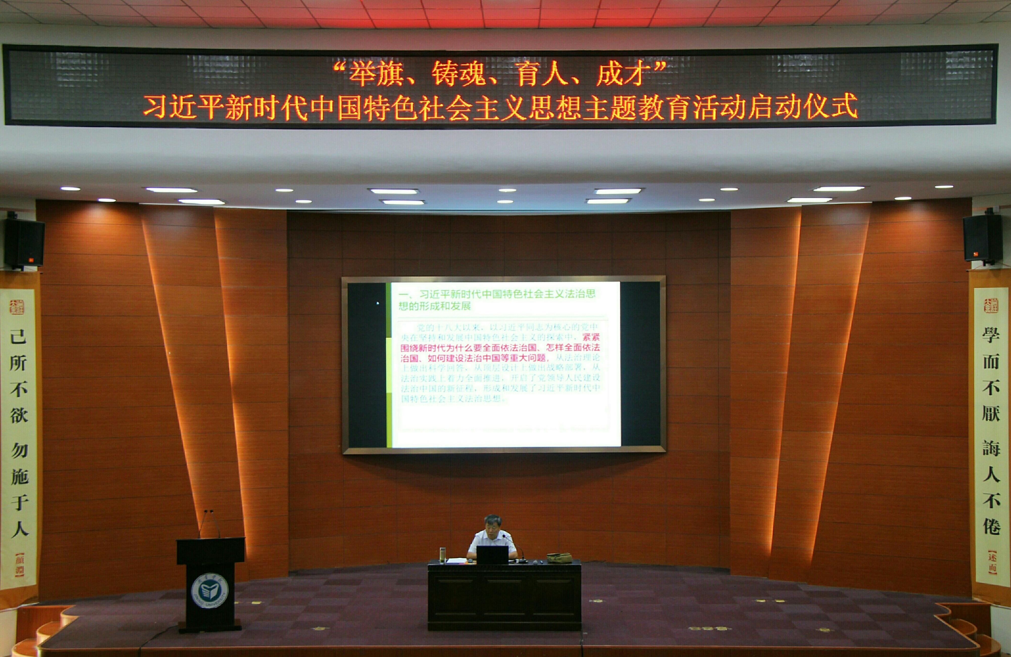 仪式上,邓新民宣读了《关于在全校师生中开展 “举旗、铸魂、育人、成才”习近平新时代中国特色社会主义思想主题教育活动实施方案。作为主题教育活动系列讲座的首场,颜景虎作了《深刻领会习近平新时代法治思想》报告。