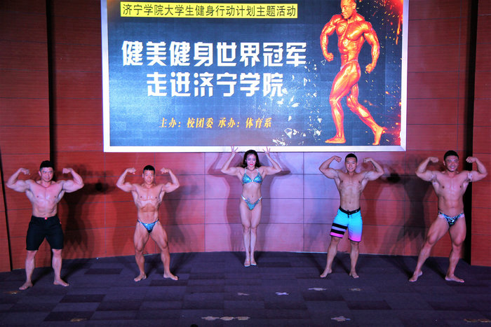 下午,“世界冠军进校园”活动在我校理科楼报告厅热烈举行,校团委书记马新蕾、体育系党总支副书记辛亚杰、团委副书记蒿鹏,部分教师代表,济宁市健美协会以及我校400余名健美健身爱好者一起参加了活动。活动由体育系团总支副书记马腾主持。