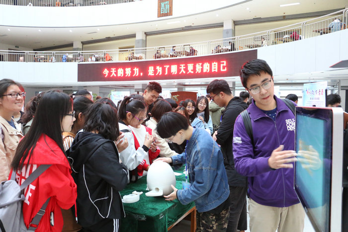 此次成果展是我校纪念改革开放40周年系列活动之一,集中展示了我校大学生近年来在创新创业方面取得的成果。本次成果展以“全面展示、注重交互、深度体验”为理念,现场分为4个区域,包括科技发明实物展、大学生创业实物展、创新创业竞赛获奖证书论文及专利展、创新创业案例展。展厅中,助力提速的智能轻骑“速行者”、高空玻璃幕布清洁机器人、擂台机器人、全自动质量分拣机、双足送水机器人、手势识别装置充分展示了我校学生在科技创新方面的大胆创意和扎实探索。精美的金属捶揲铜器、现场制作的陶艺作品,民族娃娃创客空间团队打造的文创玩偶,鞣制牛皮皮面浮雕,展现了中国传统文化和现代艺术的和谐交融。传统茶艺、花艺和香道展示体验活动吸引了师生们驻足观摩和亲身体验。