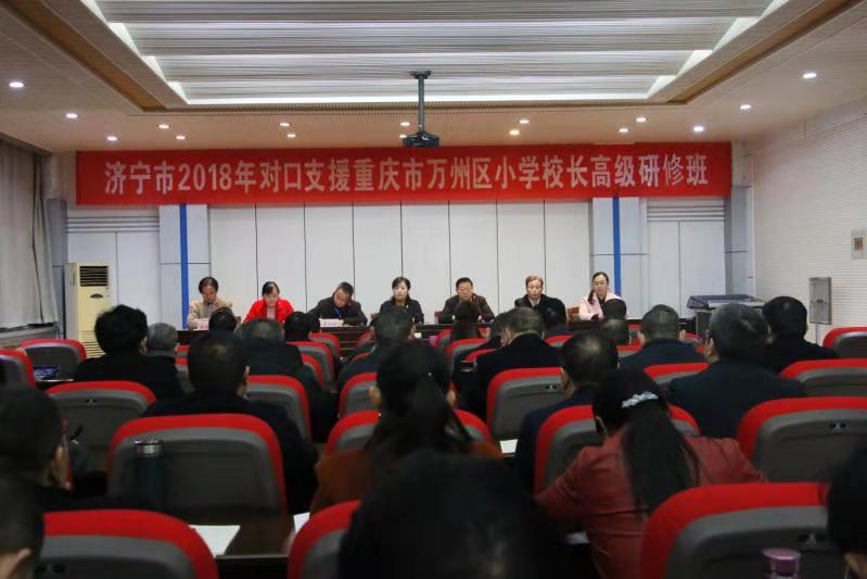 济宁市2018年对口援助重庆市万州区小学校长高级研修班是山东省对口支援重庆市的项目之一,学校接到培训任务后,以高度的政治责任感完成了培训班的各项筹备工作,安排了5场专家讲座、4场办学经验分享、2所知名小学的现场教学和4场传统文化体验等丰富多彩的活动,力争高质量的完成培训工作,为山东省对重庆市的对口支援工作贡献力量。