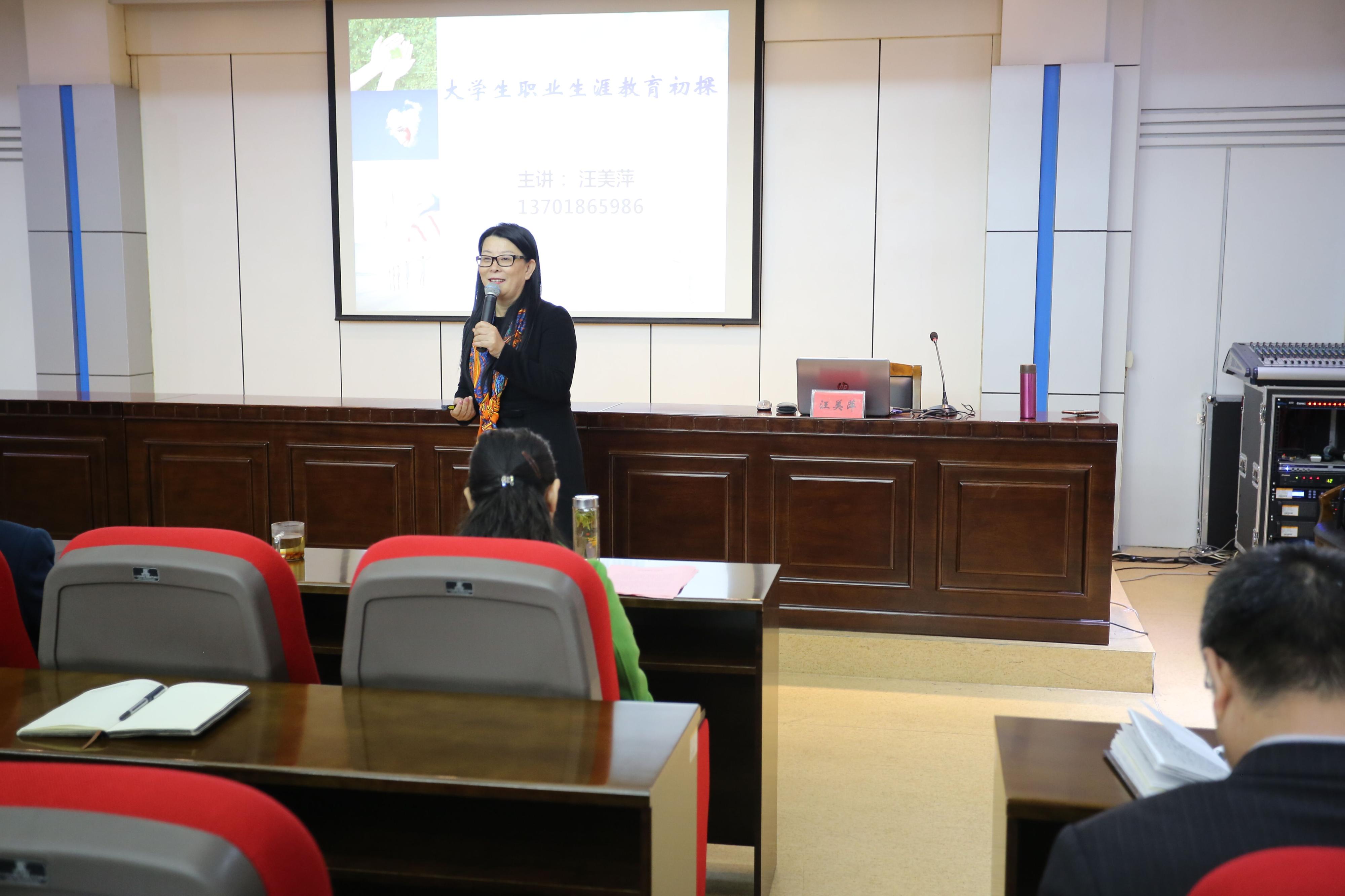 为促进大学生职业生涯规划课程建设,推进学校就业指导服务工作,11月26日,学校特邀全国职业生涯规划领域知名专家汪美萍来校作专题报告。学校党委副书记马恩出席报告会,各系就业创业工作领导小组成员、承担职业生涯规划及就业指导课的任课教师、全体辅导员及学生工作管理人员参会,报告会由招生与就业指导处处长王东艳主持。