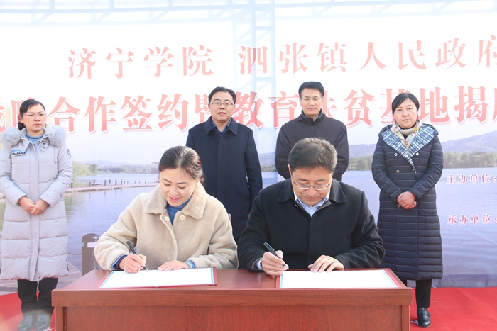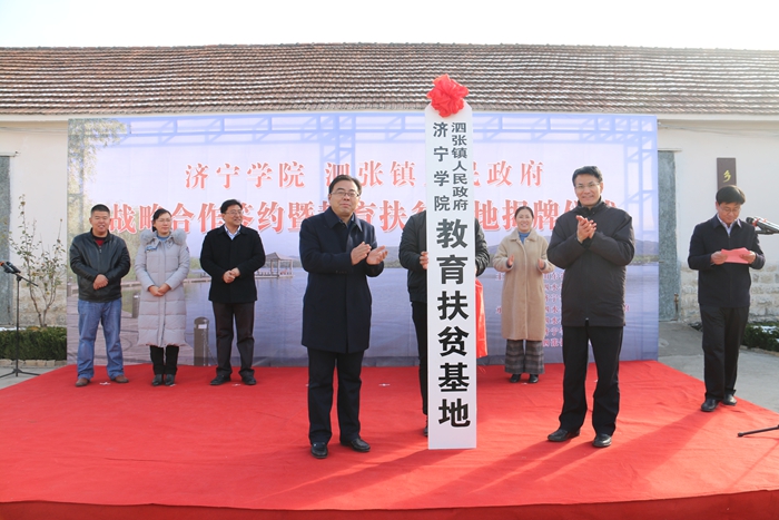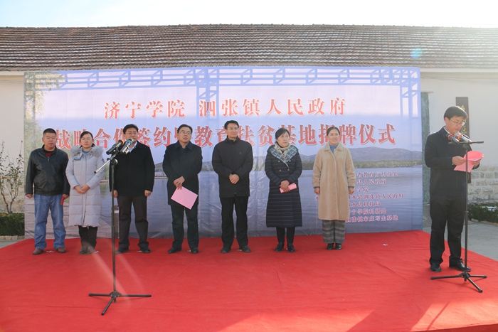 12月7日,我校与泗张镇人民政府战略合作签约暨济宁学院教育扶贫基地揭牌仪式在泗张镇举行。山东省教育厅科技处副处长曾宪文出席并讲话,我校党委委员、副院长王旭英,泗水县副县长孔繁华出席并致辞,泗张镇党委书记韩光辉,泗水县科技局副局长张莲莲,我校科研处、生命科学与工程系、经济管理系、文化传播系、美术系、宋庄写生基地负责人及部分科技扶贫专家参加揭牌仪式。揭牌仪式由泗张镇镇长王强主持。