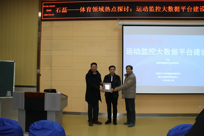 报告会上,石磊校友以《体育领域热点探讨:运动监控大数据平台建设》为题,从大数据平台建设的政策背景;举重、足球、篮球大数据现状;运动监控整体科技备战规划的系统性;科技备战大数据发展规划四个方面讲述了运动监控大数据平台建设的背景、构成框架、功能及未来规划。尤其重点举例讲解了中国举重队备战2020东京奥运会运动检测数据指标体系的构建。报告既有理论高度,又有实践意义,使全面体育系师生了解了“运动监控大数据平台建设”的重要性,受到了热烈欢迎。