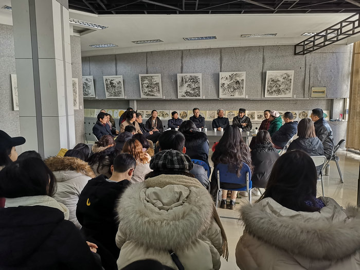 此次画展共展出我系教学实践指导老师燕一群,优秀校友张承兵、丰伟作品100余件。 画展分为儒家文化与曲阜题材主题创作、山水画、人物画、绘瓷四个展区。画面雄浑、悠远的艺术风格与诗意的表达,向学生传递了“中和之美” 、“格物致知”等儒家美学思想;绘瓷作品展现了笔墨意趣和空间构成在不同绘画载体的呈现。展出作品笔墨丰富,富有新意。展览当日举办了专题座谈会,与会专家学者各抒己见,与学生互动积极,学术氛围浓厚。