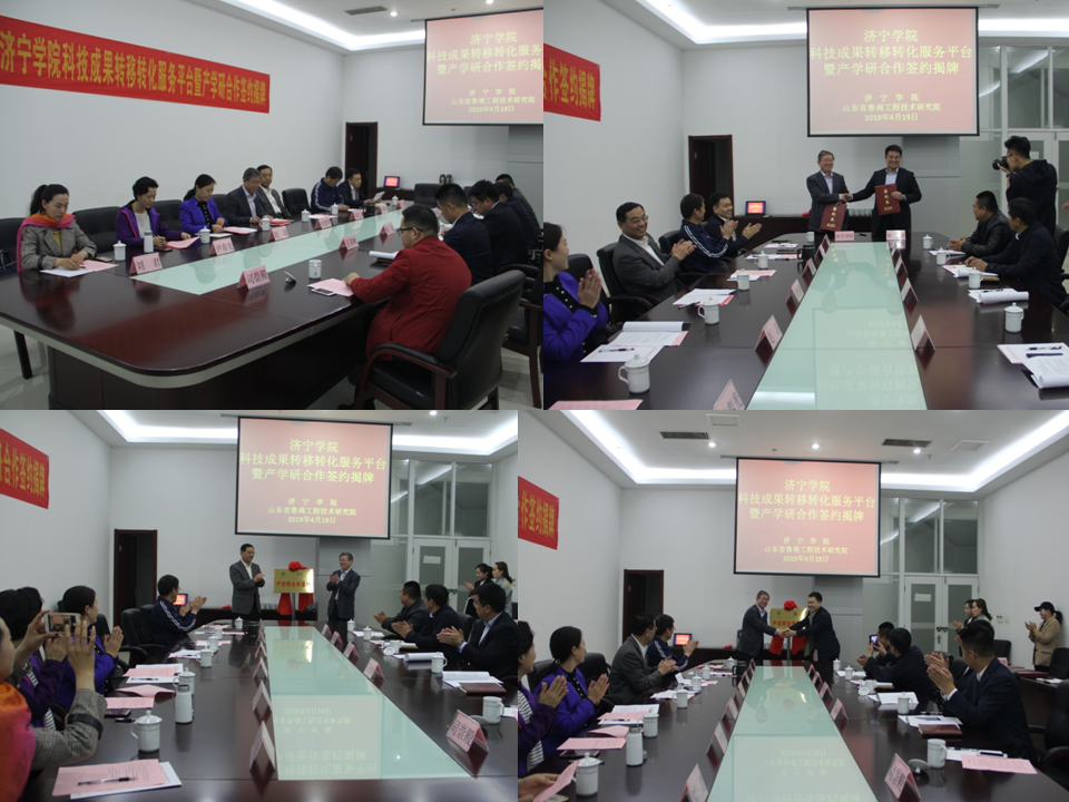 刘德胜与马红卫共同为济宁学院科技成果转移转化服务平台和济宁学院产学研合作基地揭牌。刘德胜与林涛分别代表校企双方签署了共建省级科技成果转移转化服务平台协议,赵洁与王传岭、孙玉龙和范振涛分别代表校企双方签署了产学研合作协议。程辉代表高新区科技与创新局在仪式上致辞,马红卫代表济宁市科技局做了总结讲话。签约仪式后,相关人员参观了山东省鲁南工程技术研究院和签约公司实验室。