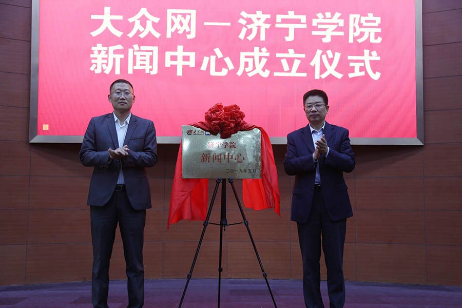 马恩与王振共同为大众网济宁学院新闻中心揭牌,刘钰与朱仙娉为大众网济宁学院新闻中心首批20名校园记者颁发聘书。