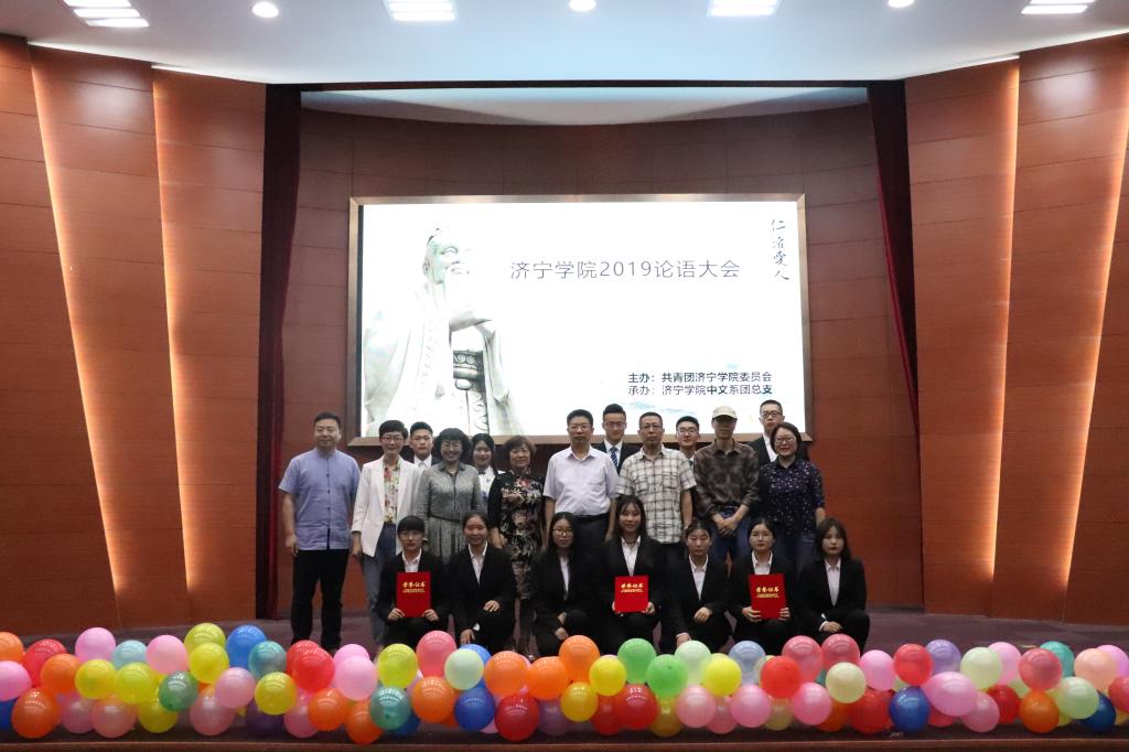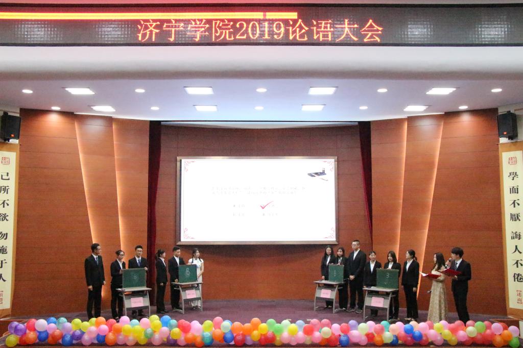 530日晚,由校团委主办,中文系团总支承办的济宁学院2019论语大会在理科楼报告厅圆满落幕。校党委副书记马恩出席活动并为获奖团队颁奖。文化传播系周新芳、中文系赵雷、田耕、王永超4位专家应邀担任大赛评委。校团委、中文系相关负责同志、各系(院)团总支负责人与学校师生400余人观看了比赛。