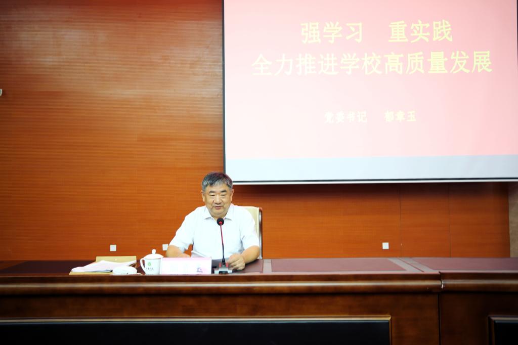 8月27日上午,党委书记郁章玉作了题为《强学习 重实践 全力推进学校高质量发展》的主题报告。报告中,郁章玉传达了全省高校党委书记校长暑期读书班主要精神,阐明了这次领导干部培训班的重要意义,对学习培训提出明确要求。郁章玉谈到,全省高校党委书记校长暑期读书班主题鲜明、内容丰富、形式多样,针对性和指导性都很强,读书班上还套开了“全省高校党的建设工作会议”。学校要充分利用暑期班的举办,认真学习贯彻全省读书班精神和全省高校党的建设工作会议精神。他要求,一要做细做实准备工作,确保“不忘初心、牢记使命”主题教育顺利开展;二要抓紧抓实党建,发挥好党建引领发展的强大动力;三要强化担当作为,着力破解高质量发展难题;四要夯实基层基础,确保学校安全稳定。