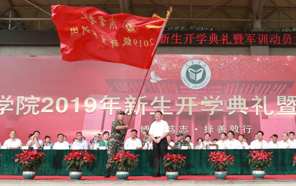 会上,党委书记郁章玉为“济宁学院2019级学生军训团”授旗。