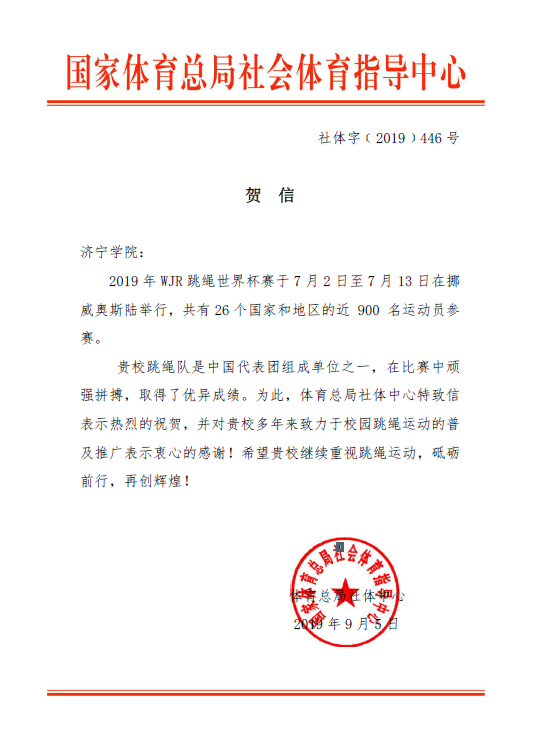近日,国家体育总局社体中心向我校发来贺信。贺信表示,中国跳绳运动代表团于今年7月份赴挪威奥斯陆参加2019年WJR跳绳世界杯赛,与26个国家和地区的近900名运动员同场竞技。我校大学生跳绳队是中国代表团组成单位之一,在比赛中顽强拼搏,取得了优异成绩。为此,体育总局社体中心特致信表示热烈的祝贺。贺信表达了并对我校多年来致力于校园跳绳运动的普及推广表示衷心的感谢。希望我校继续重视跳绳运动,砥砺前行,再创辉煌!
