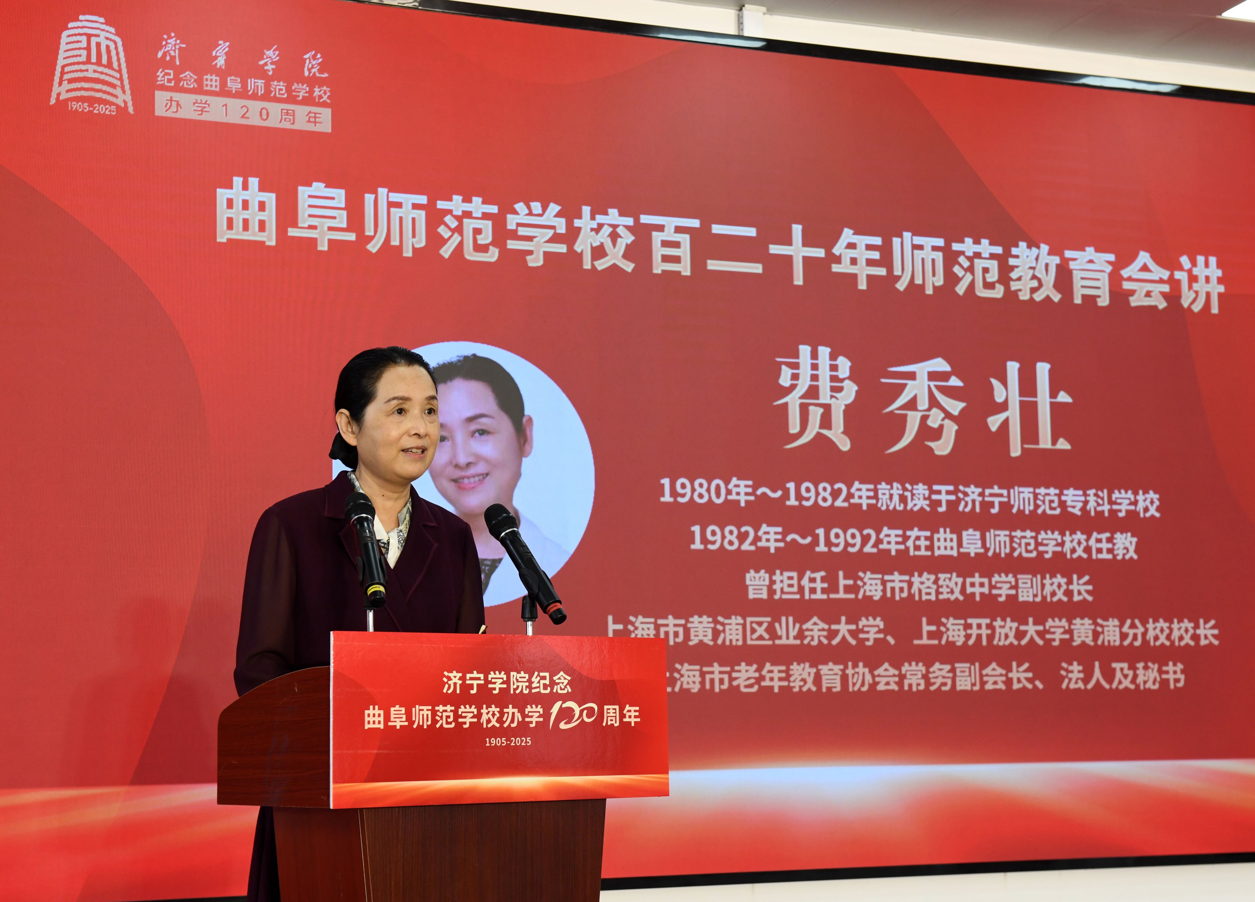 校友代表费秀壮在致辞中表达了对母校的赞美之情。她说,曲阜师范学校这120年,从孔令贻创办新式学堂,到“红二师”传承至今的红色基因,再有万里委员长的革命家政治家风范,始终在滋养着每一代教育工作者,已经成为济宁学院引以为荣的精神血脉、榜样力量——以“木铎”为志,承教化天下之责,在新时代薪火相传。